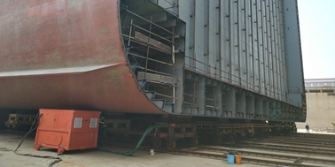 2018年6月23日,上午10:18,在武船重工船塢內(nèi),伴隨著設(shè)備的轟鳴聲, 來(lái)自全球第三大集裝箱班輪航運(yùn)公司“法國(guó)達(dá)飛海運(yùn)集團(tuán)”的一條長(zhǎng)365.5米的集裝箱貨輪被從中推開(kāi)。自重達(dá)2萬(wàn)噸的船首段沿軌道平穩(wěn)向前移動(dòng)了30米,拉開(kāi)了國(guó)內(nèi)乃至全球首例大型集裝箱船加長(zhǎng)改裝的序幕。